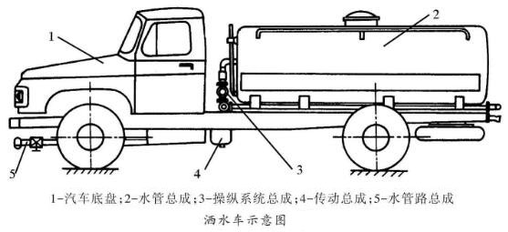 用汽車底盤改裝的灑水車除底盤外,專用裝置由水罐、傳動系統(tǒng)、噴管系統(tǒng)和操縱系統(tǒng)組成,如圖所示。