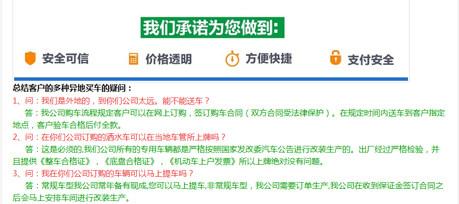 | 2、購(gòu)車流程: | 1、咨詢洽談(電話洽談或來(lái)廠考察洽談) 2、簽訂汽車購(gòu)銷合同(傳真、郵遞或者來(lái)廠簽訂) 3、我廠按時(shí)按質(zhì)生產(chǎn) 4、交付驗(yàn)收 >>點(diǎn)擊查看詳細(xì)內(nèi)容 |